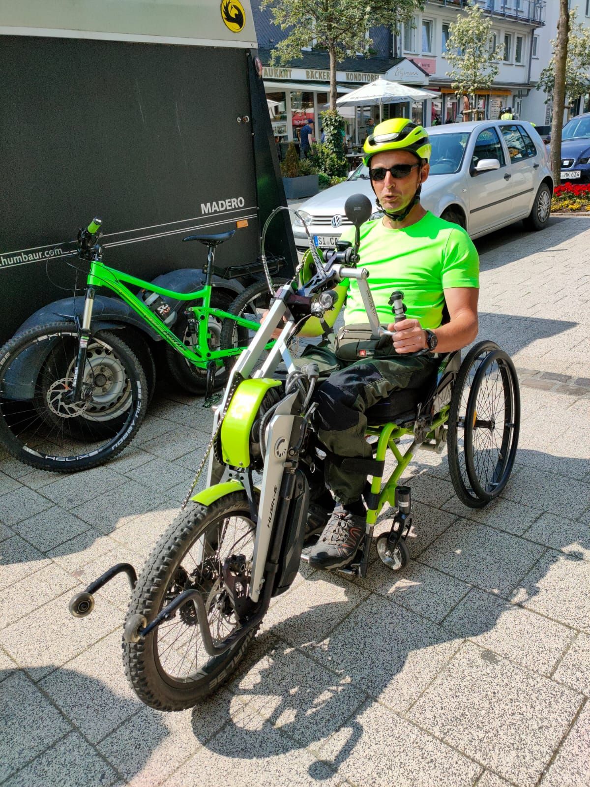 Um mich fit zu halten, (und weil es einen Mordsspaß macht) habe ich ein elektrounterstütztes Handbike Husk-E der Firma Pro Activ, womit ich Tagestouren von bis zu 100 km zurücklegen kann.